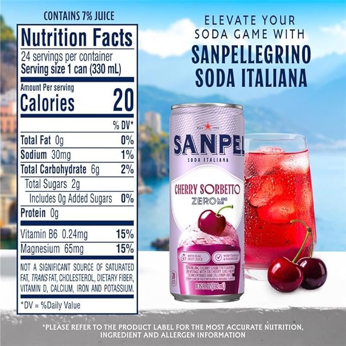 Think you know soda? This is Italian soda - and it hits different Delight in the zing of ripe cherry juice and a cool sorbet twist, all with 0g added sugar, and a blend of Vitamin B6 and Magnesium. Sanpellegrino Rooted in Italy's effortless way of living, this elevated soda delivers bold flavor for those refreshing, feel good moments. Our Italian soda is perfect for your special occasions with family and friends -- enjoy our 24 pack soda on its own or as a mixer or mocktail base for birthday drinks, party drinks, and as the perfect companion for celebrations like an anniversary party, movie night, and gatherings.